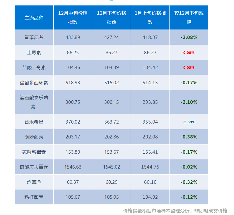2、随春节临近,中下游相应产品仓位基本平稳,供销进入低量阶段,市场价格缺乏市场成交刺激,进入平稳期。相比往年,盐酸多西环素、氟苯尼考、泰乐菌素等市场消耗较大的常用品类,仓位明显低于以往。贸易之间成交较前期减少,库存仓位基本成型。下游市场对弱势品类备货意愿低,多观望节后为主。