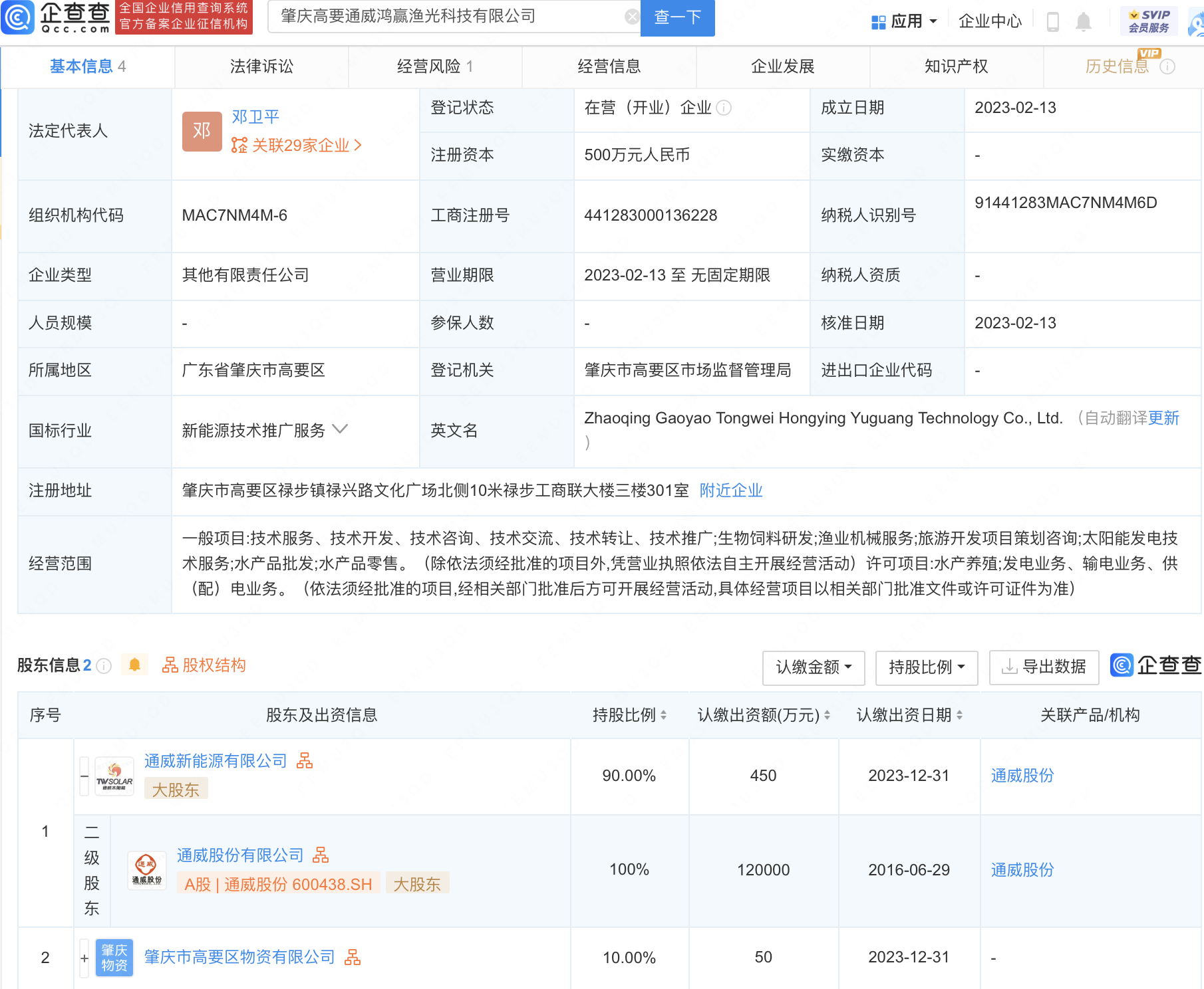企查查APP显示,近日,肇庆高要通威鸿赢渔光科技有限公司成立,法定代表人为邓卫平,注册资本500万元人民币,经营范围包含:生物饲料研发;渔业机械服务;旅游开发项目策划咨询;太阳能发电技术服务等。企查查股权穿透显示,该公司由通威股份(600438)全资子公司通威新能源有限公司、肇庆市高要区物资有限公司共同持股。