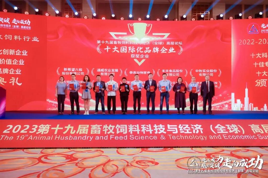 19日下午,论坛举行第十九届畜牧饲料行业“十大国际化品牌企业、十大科技产业化创新企业、十佳专精特新价值企业”三大奖项颁奖仪式,新希望六和获得“十大国际化品牌企业”奖。