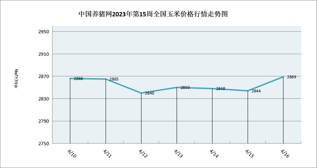 二、玉米价格震荡趋稳据中国养猪网猪价系统数据监测,2023年第15周(2023年04月10日至2023年04月16日)本周我国玉米价格整体呈涨跌调整态势,周初较为平稳,周中出现波动,以小幅走跌为主,周末价格回暖。全周玉米价格区间在2840-2869元/吨,周初期玉米价格为2866元/吨,周末期价格为2869元/吨,全周玉米价格累计上涨了3元/吨。