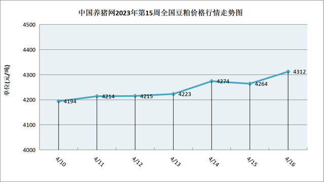 三、豆粕价格震荡回温据中国养猪网猪价系统数据监测,2023年第15周(2023年04月10日至2023年04月16日)本周豆粕价格前期较为平稳,周中和周末出现小幅回温上涨行情。全周豆粕价格区间在4194-4312元/吨之间,周初豆粕价格为4194元/吨,周末价格为4312元/吨,全周豆粕价格累计上涨了118元/吨。
