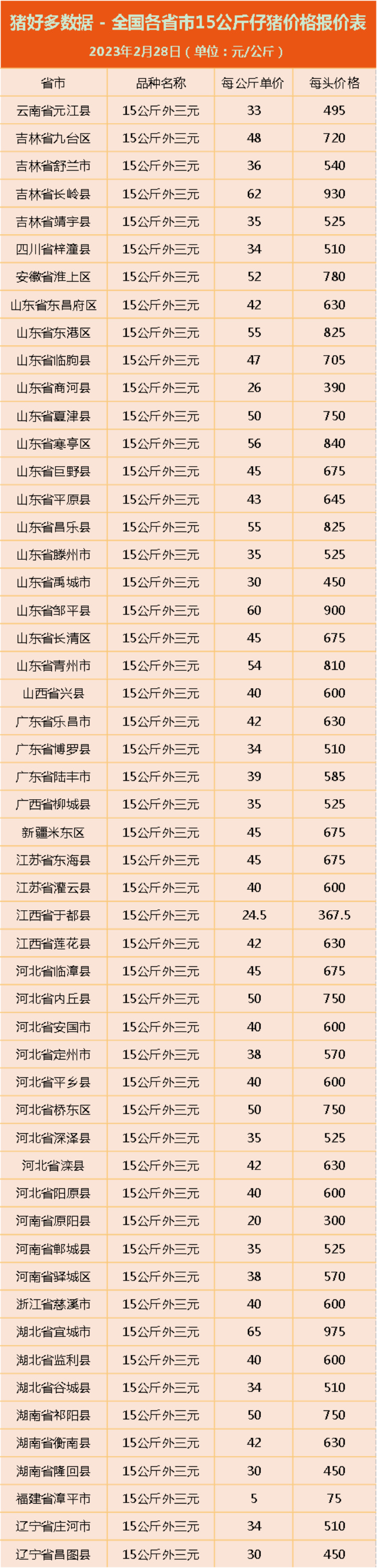 据猪好多数据2月28日监测显示,吉林省15公斤外三元仔猪价格主流价为540-720元/头;四川省15公斤仔猪价格主流价为450-560元/头;山东省15公斤外三元仔猪价格主流价为550-810元/头;山西省15公斤外三元仔猪价格主流价为500-700元/头;广东省15公斤外三元仔猪价格主流价510-630元/头;#仔猪价格#