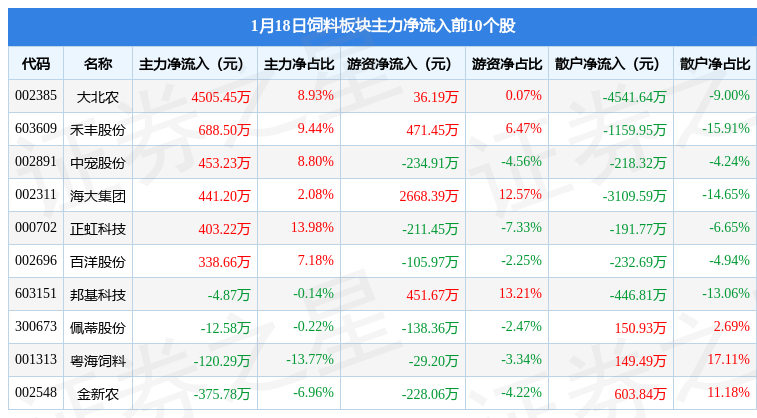 从资金流向上来看,当日饲料板块主力资金净流出1566.95万元,游资资金净流入1458.85万元,散户资金净流入108.09万元。饲料板块个股资金流向见下表:
