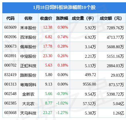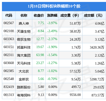 1月18日饲料板块较上一交易日下跌1.45%,唐人神领跌。当日上证指数报收于3224.41,上涨0.0%。深证成指报收于11810.66,上涨0.09%。饲料板块个股涨跌见下表: