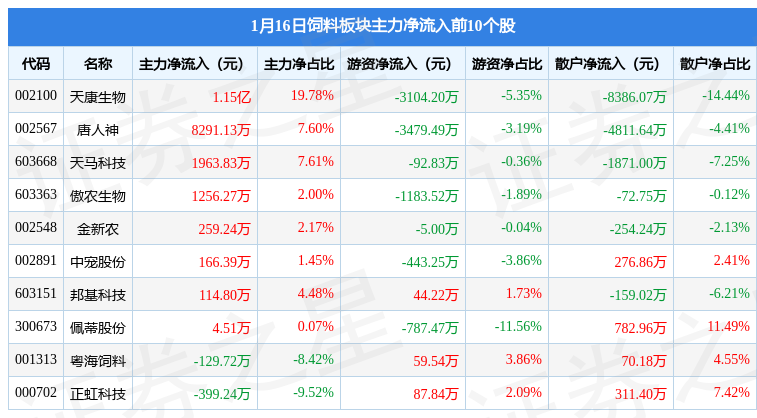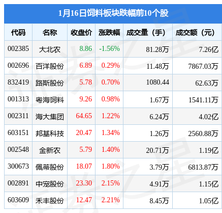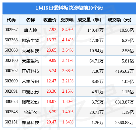 1月16日饲料板块较上一交易日上涨1.59%,唐人神领涨。当日上证指数报收于3227.59,上涨1.01%。深证成指报收于11785.77,上涨1.58%。饲料板块个股涨跌见下表: