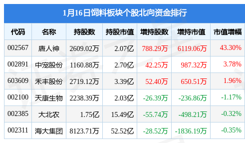 北向资金方面,当日饲料板块北向资金持股市值为78.21亿元,增持0.52亿元。其中增持最多的是唐人神,增持了0.61亿元。减持持最多的是海大集团,减持了0.18亿元。饲料板块北向资金持股变动明细见下表: