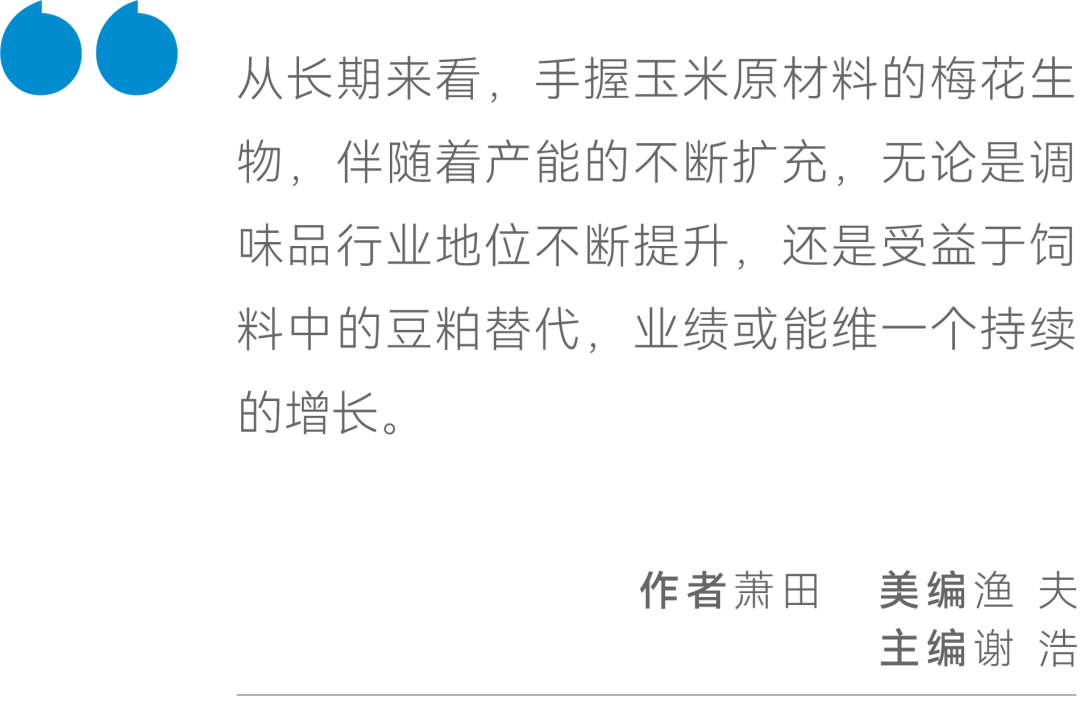 从长期来看,手握玉米原材料的梅花生物,伴随着产能的不断扩充,无论是调味品行业地位不断提升,还是受益于饲料中的豆粕替代,种种迹象表明,梅花生物的业绩或能维一个持续的增长。