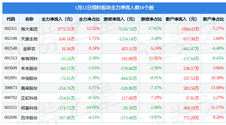 从资金流向上来看,当日饲料板块主力资金净流出9359.51万元,游资资金净流出4417.29万元,散户资金净流入1.38亿元。饲料板块个股资金流向见下表: