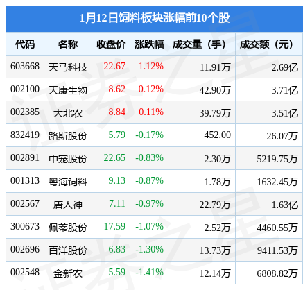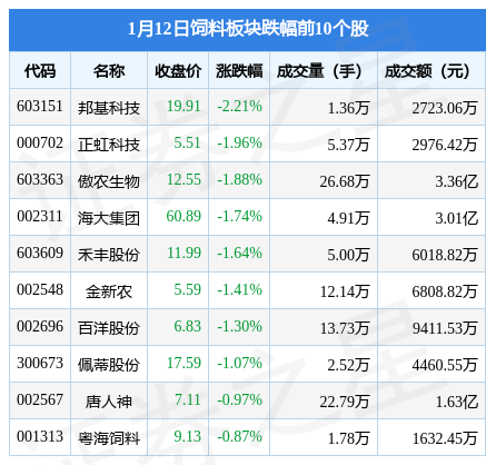 1月12日饲料板块较上一交易日下跌1.15%,邦基科技领跌。当日上证指数报收于3163.45,上涨0.05%。深证成指报收于11465.73,上涨0.23%。饲料板块个股涨跌见下表: