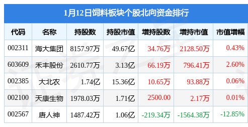 北向资金方面,当日饲料板块北向资金持股市值为70.92亿元,增持0.15亿元。其中增持最多的是海大集团,增持了0.21亿元。减持持最多的是唐人神,减持了0.16亿元。饲料板块北向资金持股变动明细见下表: