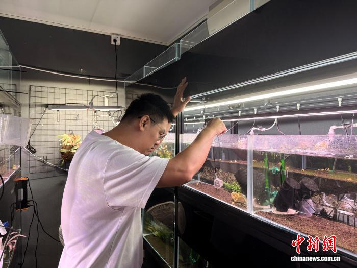 台青关立廷在位于上海的工作室里检查水晶虾养殖状况。 谢梦圆 摄追梦之旅并非一帆风顺,由于缺乏养殖经验,阿关的第一缸鱼虾很快全军覆没。不甘心的他从此潜心钻研,不仅遍览网络教程,更是主动登门讨教,拜访上海和台湾两地水晶虾圈的资深玩家。